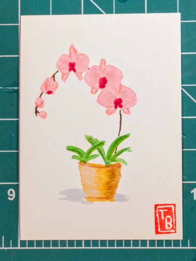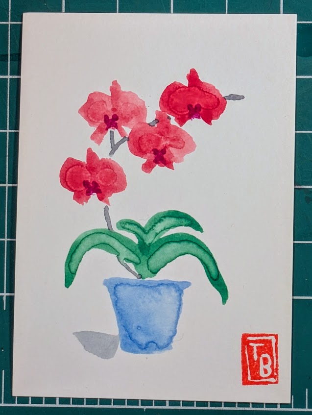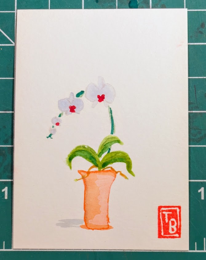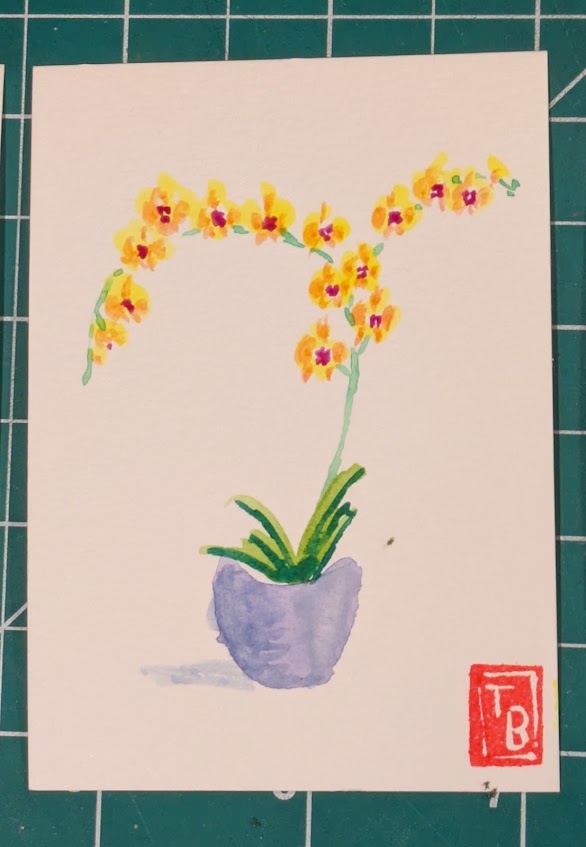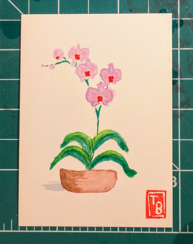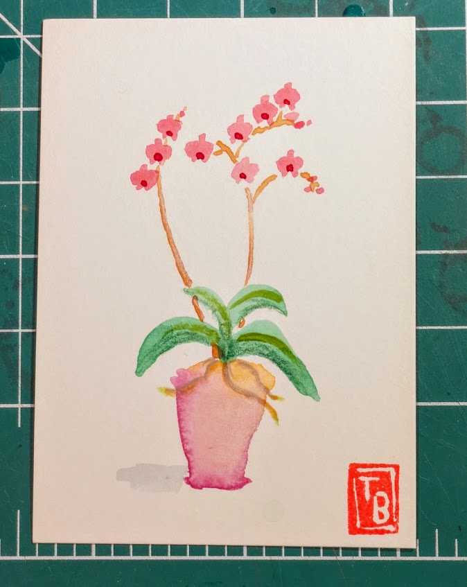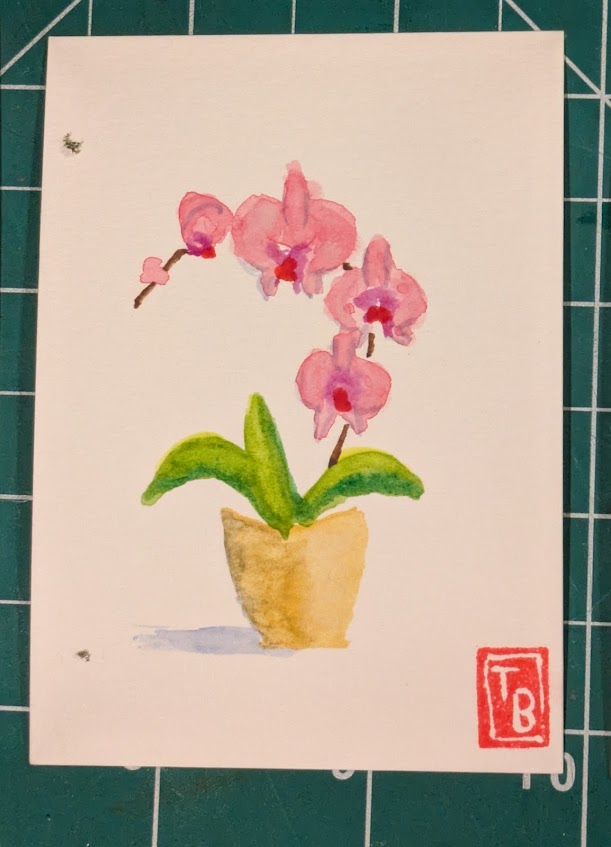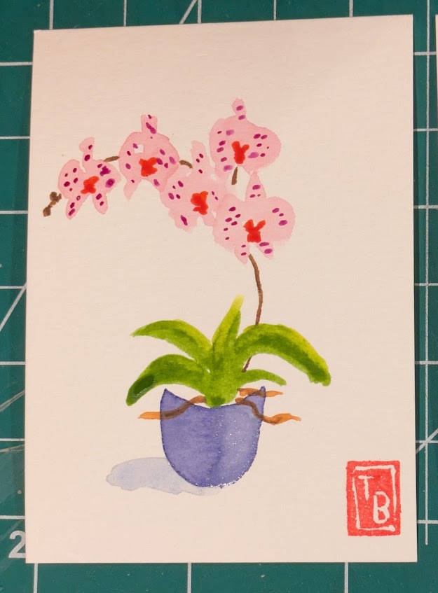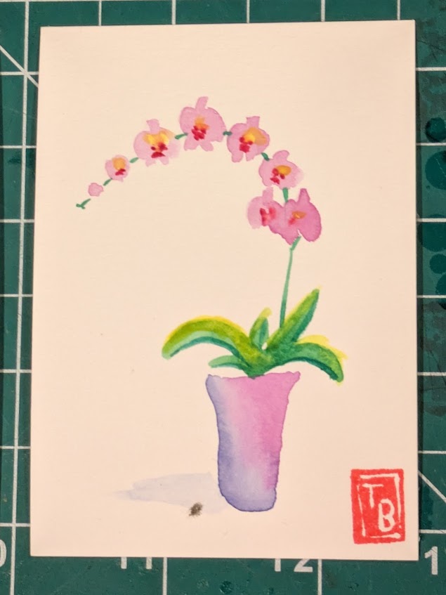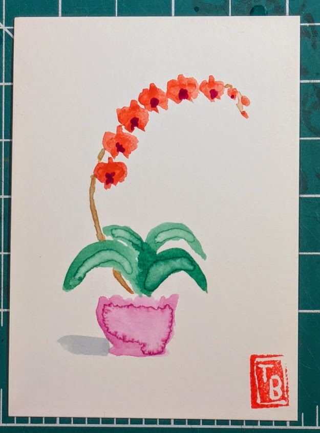 I’ve been painting the same theme (orchids) with watercolor but in different ways. In one set of cards, I added detail using colored pencils. In another, I used the backrun (or bloom) technique to produce areas of interest.