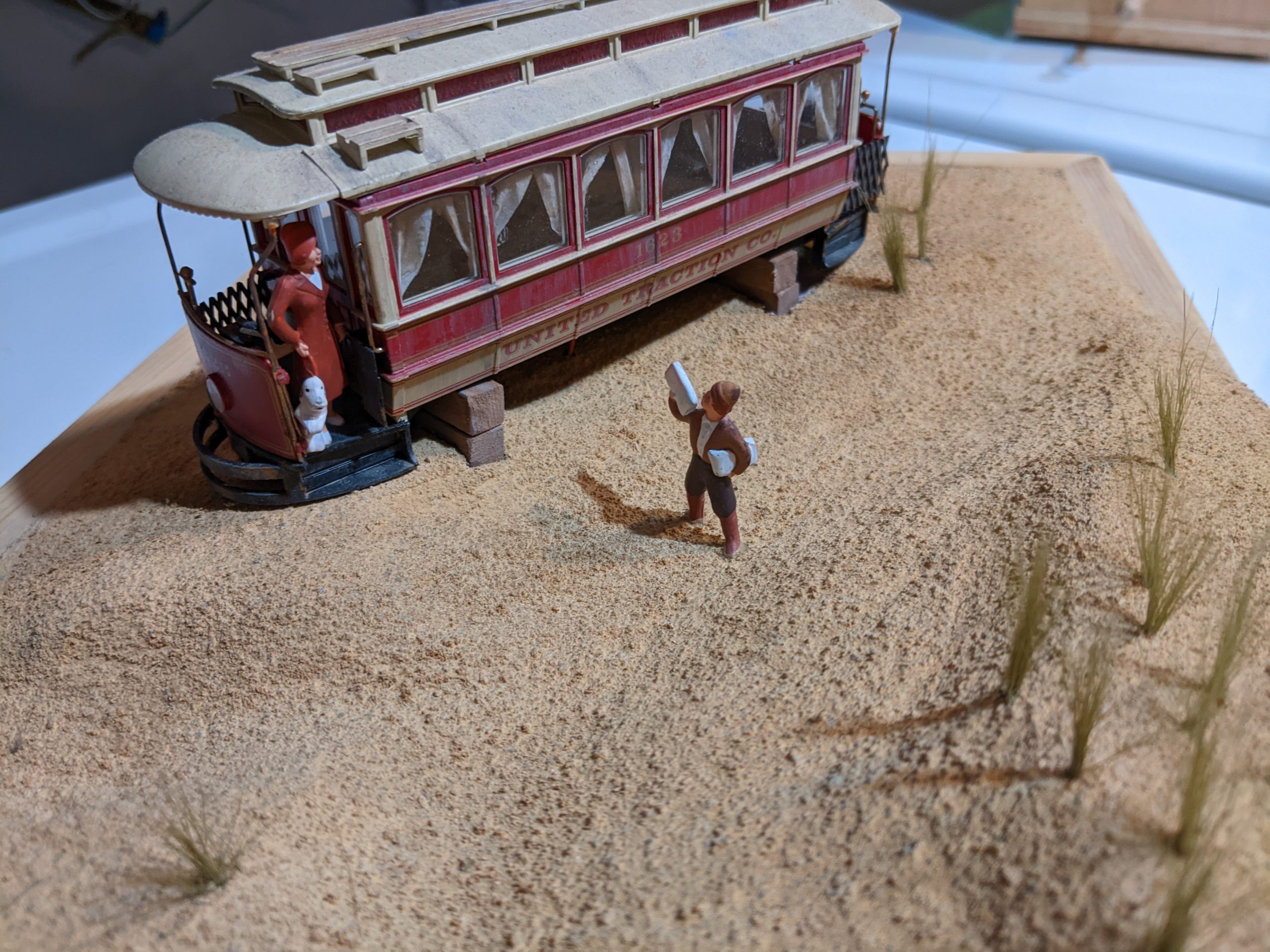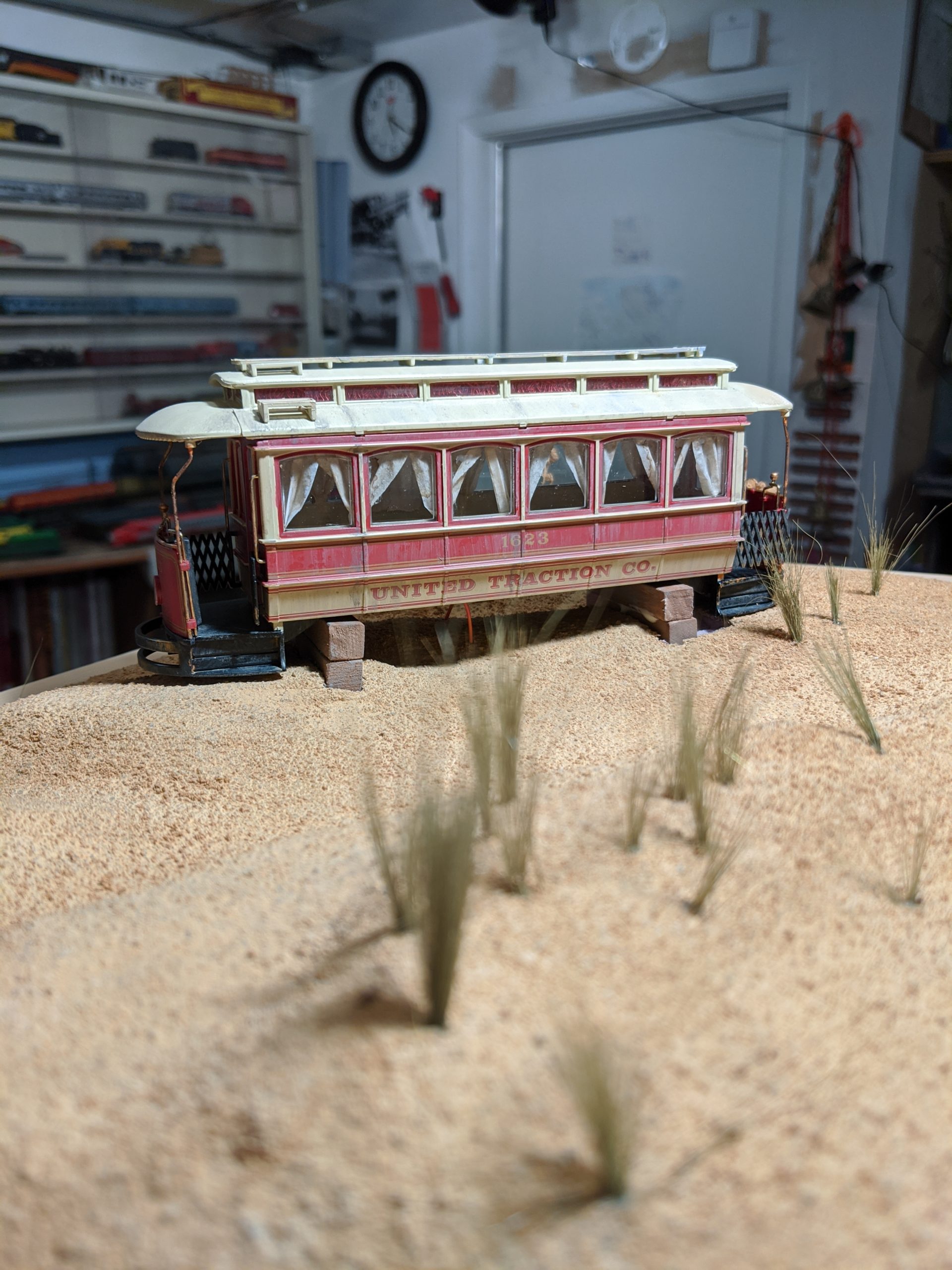 I built a diorama to capture the spirit of it. Started with a Bachmann O-scale plastic model. Opened it up, added tissue curtains for a lived-in feel. Weathered it to show its age. The platform? Paper mache, real sand, and bits of jute for weeds. 3D-printed a bathtub. A fence made from wooden coffee stirrers. Tossed in more details to make it feel like home.
