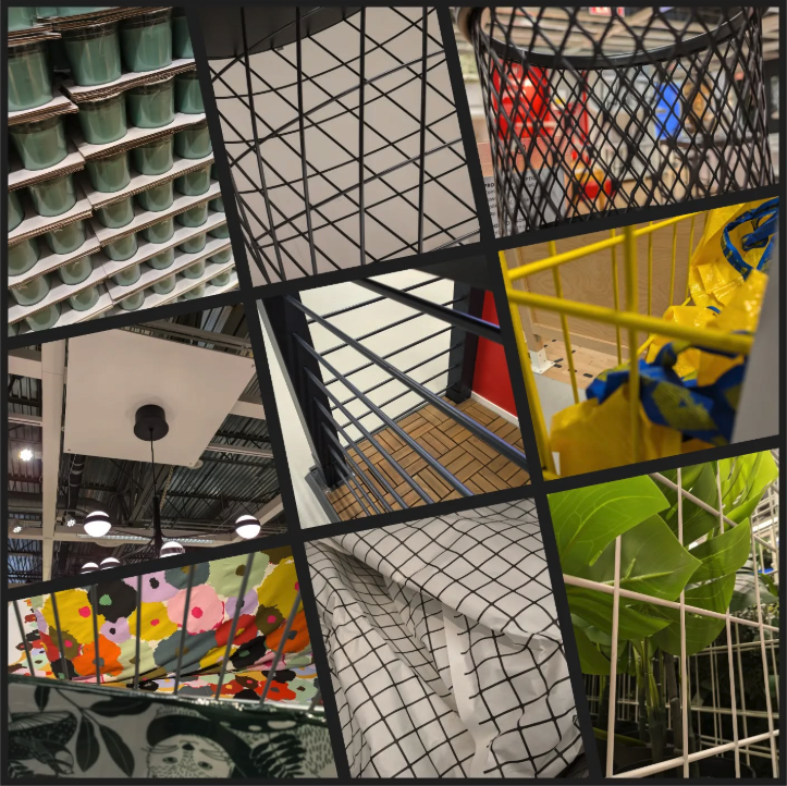 At a recent trip to IKEA, I was struck by the how precisely the store is designed exactly in the way the Situationists describe, like a micro city designed to promote productivity and consumption. So as we snaked our way through the set path, I allowed my eye to catch something, anything to subvert it. Eventually I started noticing the theme of meshes and grids. Here is my photo-collage of my dérive…