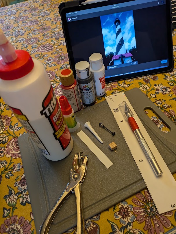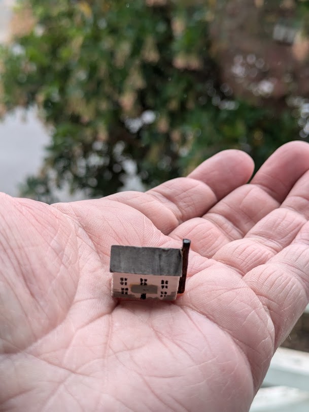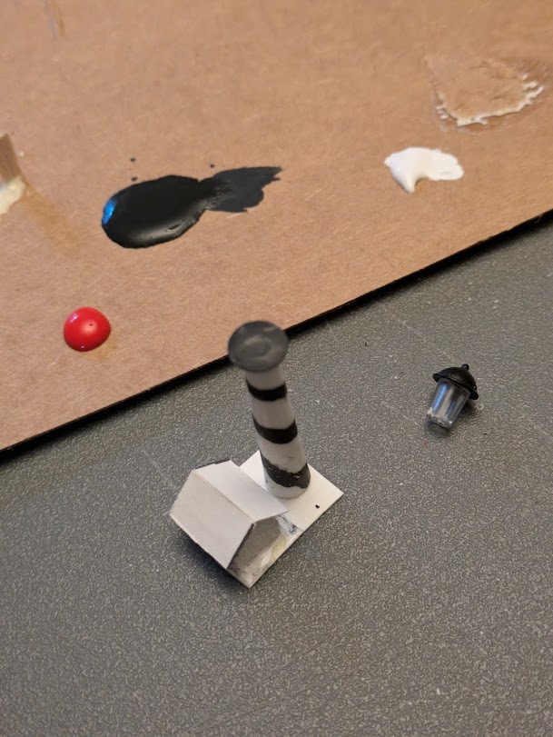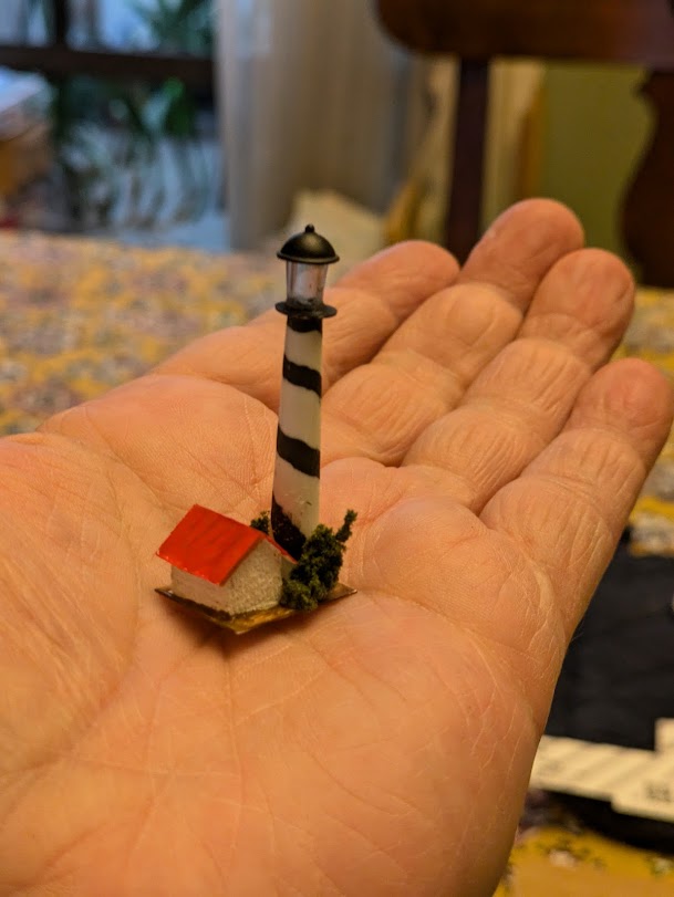 I’m always finding new ways to practice art daily, and it helps to find things that I can finish in under 30 minutes. One material that’s easy to cut and paint is balsa wood, so on two different days in September I made this cottage and lighthouse. The houses themselves are balsa with cardstock roofs, and the lighthouse tower started as a golf tee. I stole the lamp housing from an N-scale streetlamp. I like doing little projects like these because they are simple but compelling. If you have a few spare moments, give it a try. All you really need for tools is a hobby knife an a paint brush.