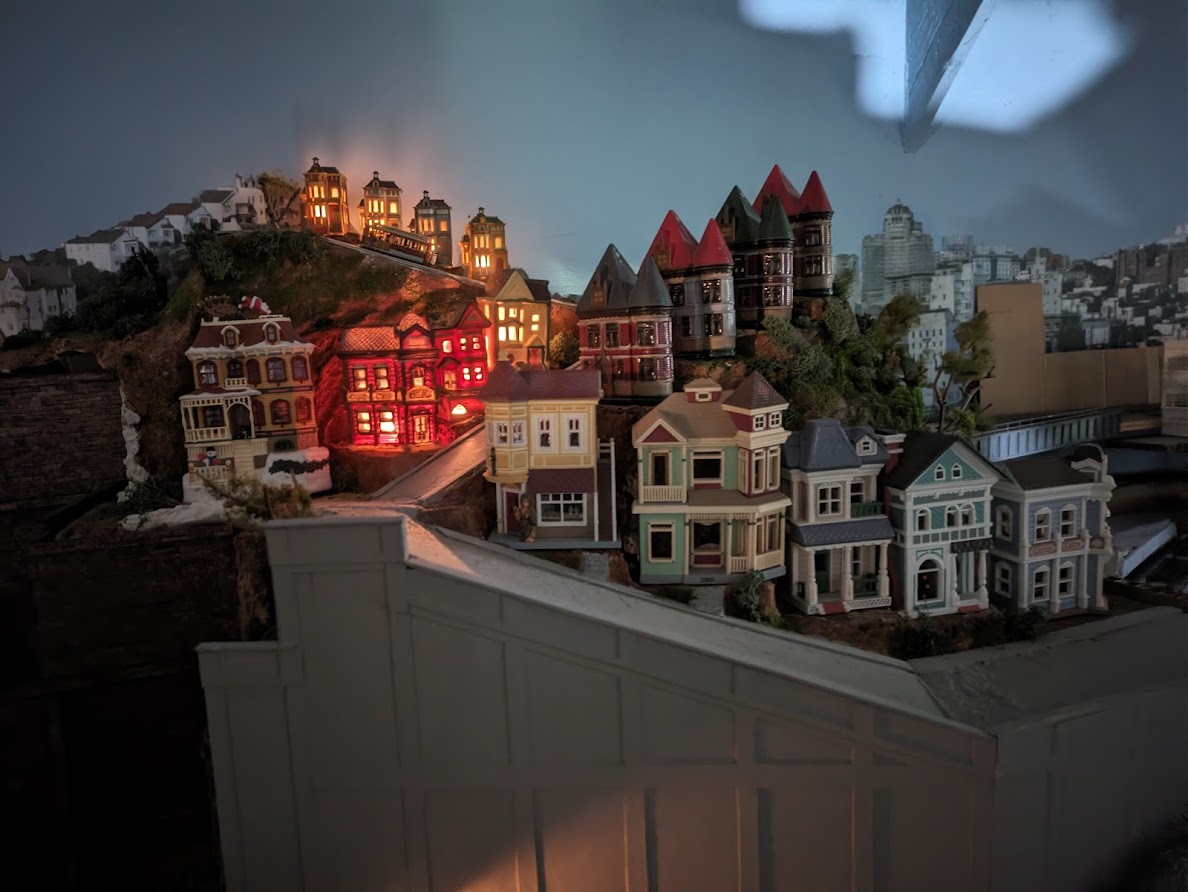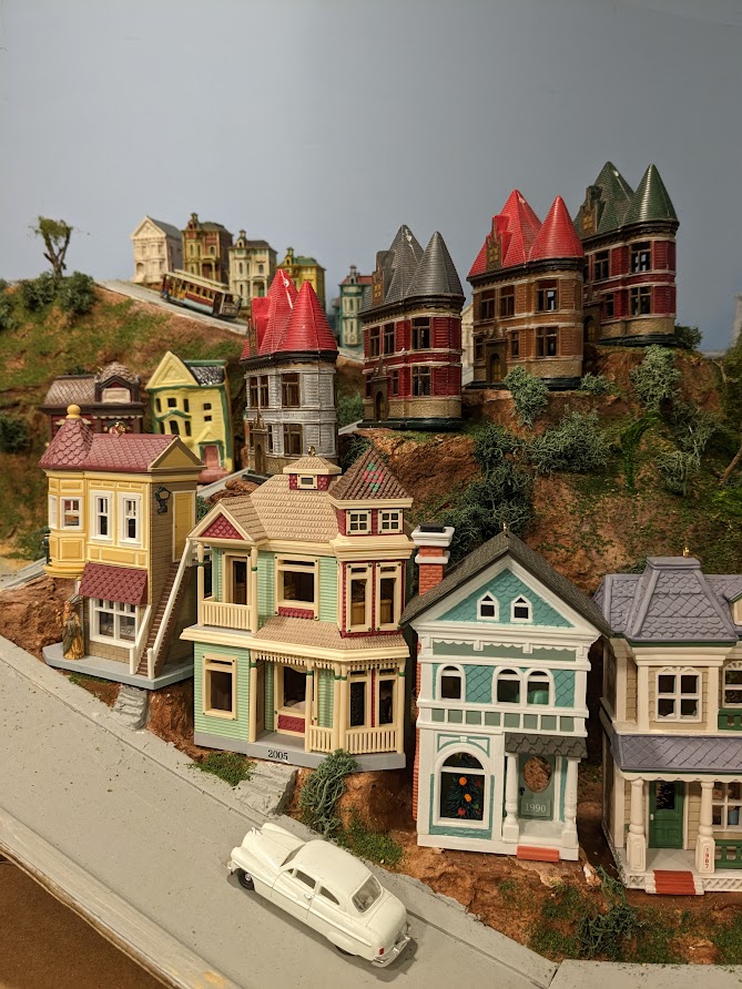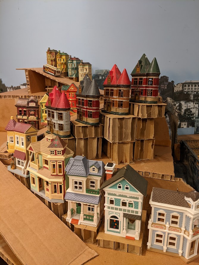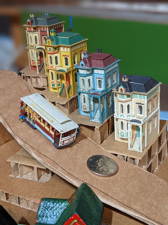 To round out the collection, I found some smaller N-scale houses for the background. They were a set of four Italianate stick houses that even came with a tiny San Francisco cable car. No markings though. I wish I knew what brand they are.