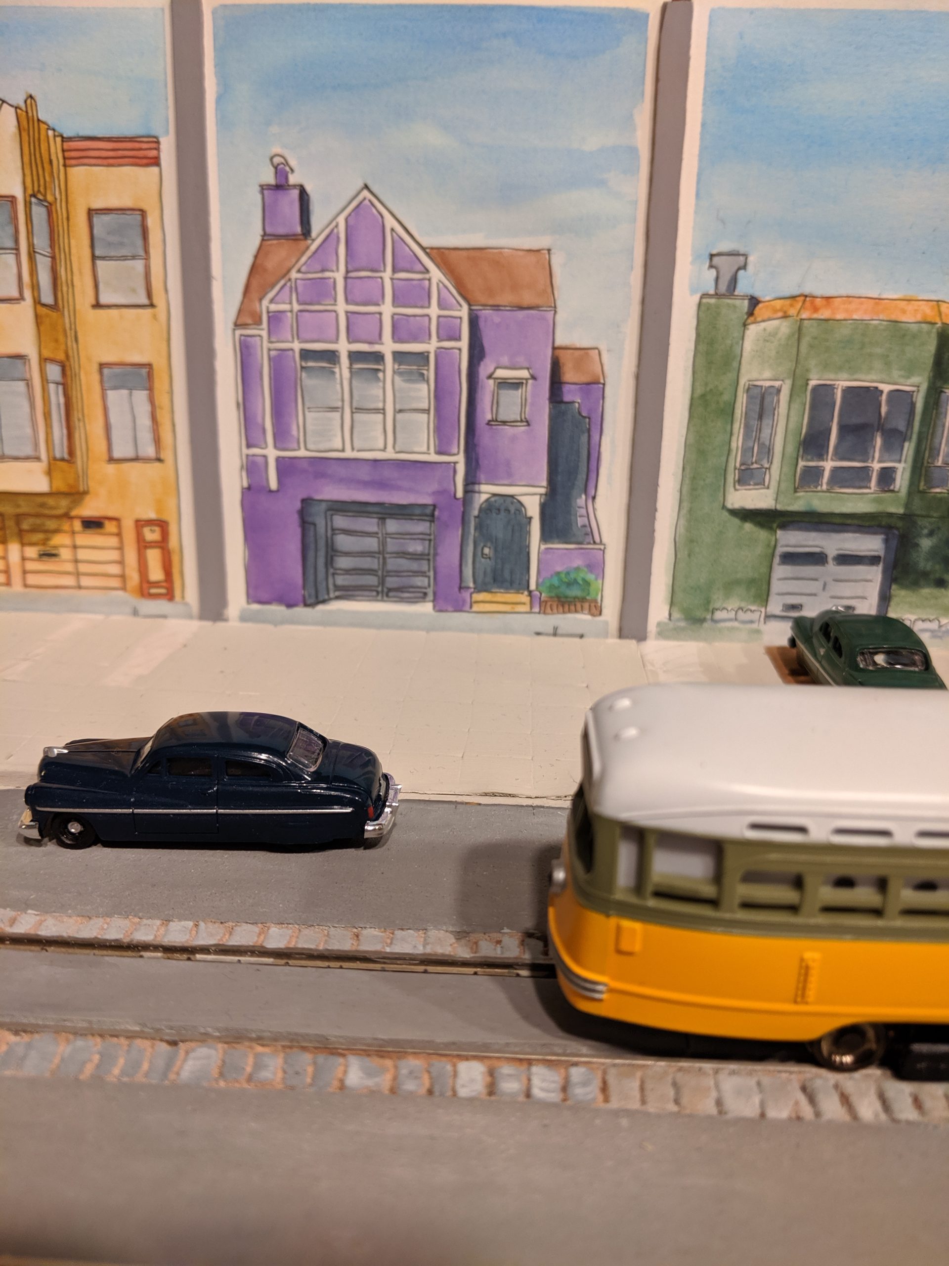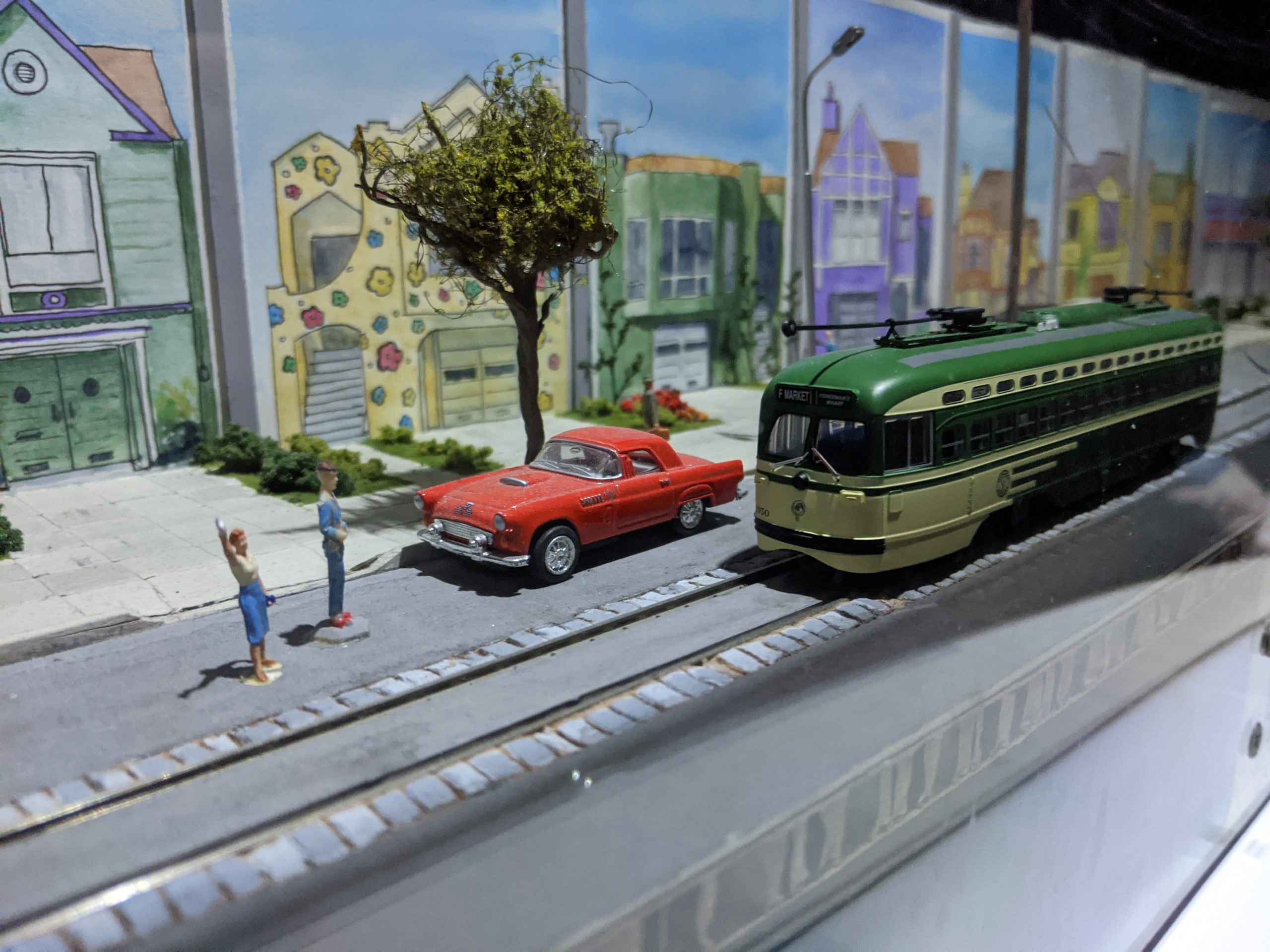 And the centerpiece: Sunset in Motion. A model streetcar rolling past watercolor postcards of Sunset homes.