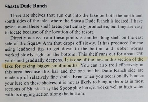 We usually ended up in the Sulanharas Creek arm. Back then, it was still called Squaw Creek. Many of Freeman’s observations about that area still hold up today, and we’ve caught many bass there. But one location in his book remained a complete mystery. He mentioned a place called Shasta Dude Ranch.